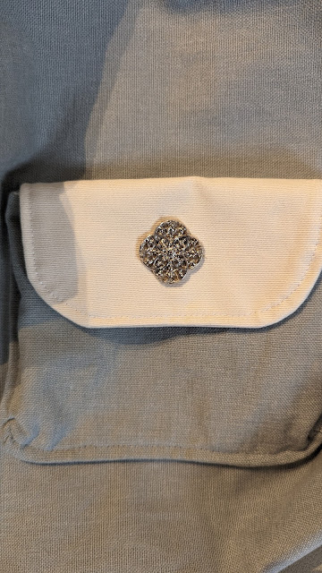 Per una fortunata serie di coincidenze, una volta deciso di provare a seguire il tutorial (completamente muto, fatta eccezione per la musica in sottofondo, ma ottimamente realizzato perché mostra passo passo tutti i passaggi e le misure) ho trovato da Giesse scampoli un bellissimo scampolo di tessuto abbastanza pesante, forse da arredo, ma con le giuste caratteristiche per diventare la stoffa principale della mia sacca. Un delicatissimo color verde salvia, con texture che ricorda il denim e una mano appena vellutata al dritto. Si abbina perfettamente ad una stoffa Ikea che avevo a casa, comprata anni fa, pesante e in origine bianca, ma che avevo tinto col caffé qualche anno fa per farne una tendina per un mobile in cucina, così da ottenere un bianco panna meno "sparato" e più caldo. Perfetta per l'interno e la patta della tasca esterna.